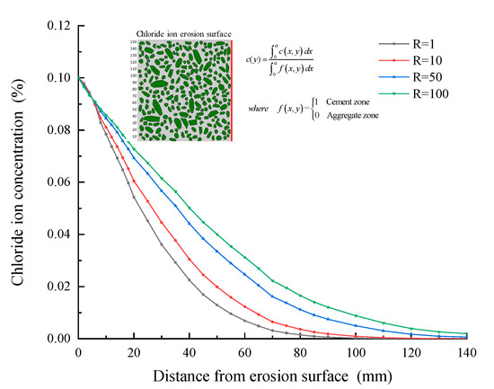 Moreover, the chloride concentration distribution curve along with the ingress depth at the 50th year is shown in Figure 14. The chloride concentration increases with the increase of chloride diffusion coefficient in ITZ. It is worth noting that the chloride concentration distribution curve with R = 50 is not in the middle of the two curves with R = 1 and R = 100. This further shows that the chloride concentration distribution is not directly proportional to the chloride diffusion coefficient in ITZ. With the increase of the multiple of the chloride diffusion coefficient in ITZ, the influence of that in the ITZ on the chloride concentration distribution is weakening. This is mainly because the chloride ion concentration is the result of the joint action of cement mortar and ITZ.