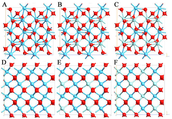 Structures of (A) m-HfO2, (B) m-Hf0.75Zr0.25O2, (C) m-Hf0.50Zr0.50O2, (D) o-HfO2, (E) o-Hf0.75Zr0.25O2, and (F) o-Hf0.50Zr0.50O2. Hf, Zr, and O are reported in blue, light blue, and red, respectively.