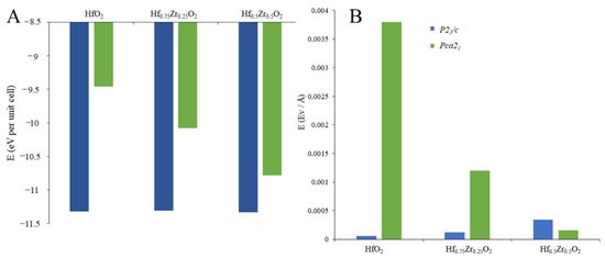 In order to gain deeper insight into the behavior of the phases and to underline the role of Zr, the PBE–GGA approach was again used to compute the ground-state cohesive energy of the polymorphs (Figure 3A). The direct comparison between m- and o-HfO2 phases outlined higher stability for the m-polymorph, as already reported in Reference [24]; negligible energetic variations were found for P21/c phases when Zr replaces with Hf atoms. Therefore, the zirconium ion exhibits an excellent doping agent for the hafnium-based oxides [9]. An opposite trend was observed for the orthorhombic polymorphs, in which the Zr doping drastically decreased the formation energy. This effect appeared to be Zr-content dependent; that is, the higher the Zr percentage, the lower the formation energy, confirming the high impact of zirconium on the phase properties and the stabilization of the ferroelectric crystal.