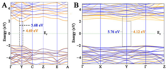 Bandgap structures of m- (A) and o- (B) Hf0.5Zr0.5O2. The blue lines highlight the bands of no-defect models, while orange lines outline the bands of defected systems.