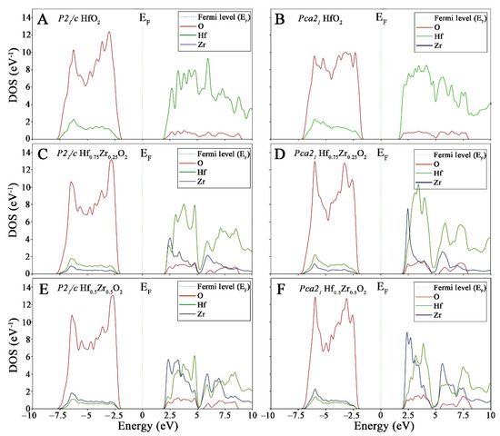 Partial density of state of HfO2 (A,B), Hf0.75Zr0.25O2 (C,D), and Hf0.5Zr0.5O2 (E,F). The m-P21/c and o-PCa21 are reported to the left and right columns, respectively.