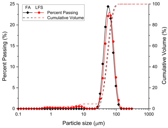 Class F FA and LFS are used as the aluminosilicate sources in this study. The sources of these materials are from Sultan Azlan Shah Power Station, Seri Manjung, Perak, Malaysia, and Southern Steel Berhad, Penang, Malaysia, respectively. The oxides components of FA and LFS determined using X-ray Fluorescence (XRF) and the loss on ignition (LOI) evaluated using the mass difference from 29 °C to 950 °C are tabulated in Table 1. FA was mainly made up of silica (56.30 wt.%) and alumina (28.00 wt.%) while the major oxides of LFS were calcium oxide (63.59 wt.%) and silica (21.30 wt.%). The particle size distribution of FA and LFS was displayed in Figure 1. FA had 80.2% of particles size finer than 65 μm with d10 = 36.3 μm, d50 = 52.6 μm and d90 = 76.5 μm whereas 74.3% of LFS particles size was finer than 65 μm with d10 = 35.6 μm, d50 = 55.2 μm and d90 = 81.0 μm. Figure 2 (Figure 2a,b) shows the microstructure of FA with spherical shapes and LFS with irregular shapes of plate-like structure.