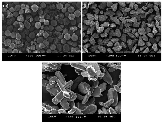 SEM micrographs of (a) FA, (b) LFS, and (c) borax decahydrate.