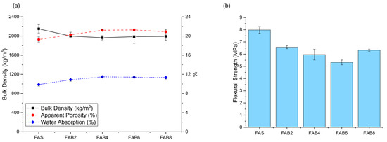 (a) Bulk density and porosity measurement and (b) flexural strength of unexposed thin FAS and FAB geopolymers.
