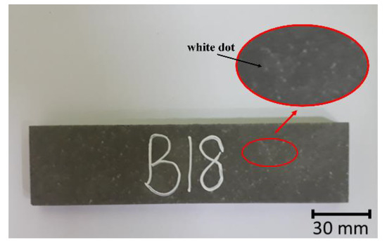 Lower flexural strength of 5.3–6.6 MPa was reported in FAB geopolymers than in FAS geopolymers. The decrease in strength was associated with the decrease in bulk density [30]. A similar decreasing trend in compressive strength was reported by Antoni et al. [31] and Bagheri et al. [22] with a higher borax dosage used in the synthesis of boroaluminosilicate geopolymers. However, these contradicted other reported works. Nazari et al. [20,21] achieved 64 MPa of compressive strength at 90 days and 9.5 MPa of flexural strength at 28 days in fly ash geopolymers alkali-activated by 0.912 borax to NaOH weight ratio. Antoni et al. [32] produced high calcium-fly ash geopolymers and reported a 6.1% increase in compressive strength by dissolving 1–5 wt.% borax into NaOH solution. The difference in the strength results might be due to the different methods of borax induction and content. In this study, borax decahydrate was used as an additive and added to the geopolymer paste during the mixing process. The larger borax particles acted only as a filling role in which the surface would not participate in the chemical reactions and thus formed a loose geopolymer structure at ambient temperature. Even the addition of borax decahydrate improved the workability of FAB geopolymers, but the high calcium LFS aided the setting of thin geopolymers (1.5–2 h). The short setting time was insufficient for the dissolution of borax, causing the borax particles to remain in the geopolymers. This was proved by the white dots spotted on the surface of the FAB geopolymers (Figure 5). Despite that, the flexural strength increased slightly in the FAB8 geopolymers. This might be due to the formation of a B–O bond as a result of the higher borax content [21]. Nevertheless, the thin geopolymers were further heat-treated to improve the flexural performance of the thin geopolymers.