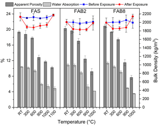 In general, the bulk density of thin geopolymers decreased with increasing temperature. This was associated with the liberation of water vapor from the geopolymer structure [35]. Nevertheless, a decrease in porosity and water absorption was observed as the heating temperature reached 900 °C. The high temperature densified the geopolymer matrix, which was caused by solidifying melt [36], reducing the pore content in thin geopolymers. Furthermore, the density loss for both the thin FAS and FAB2 geopolymers at 1100 °C and 1000 °C, respectively, was relatively small. This was related to the shrinking of the sample due to heat or matrix densification, recompensing the mass loss [37]. However, a drastic increase in bulk density of FAB8 geopolymer was reported at 1000 °C, with a 7.3% gain in density. This was attributed to the thermal shrinkage (13.0% mass loss and 14.3% volume loss) (Table 2) caused by the densification and crystallization of the geopolymer structure, which improved the interparticle connectivity as supported by Rickard et al. [38].