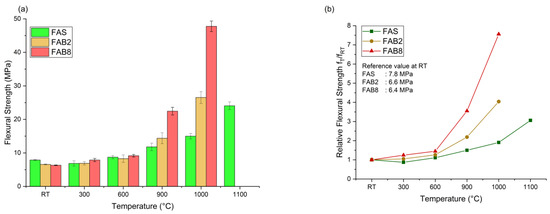 (a) Flexural strength and (b) relative flexural strength of FAS and FAB geopolymers at different elevated temperatures.