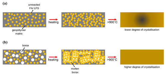 Schematic diagram of thermal transformation of thin geopolymers (a) without and (b) with borax decahydrate addition.