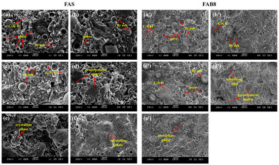 Figure 10 illustrates the microstructure of FAS and FAB8 geopolymers at different elevated temperatures. The unexposed geopolymers (Figure 10a,a′) had a looser but smooth structure with some coarse pores and unreacted FA particles. C–S–H gels were observed as the results of LFS alkali activation. With the aid of thermal treatment, the geopolymer structure became denser and smoother, because of the increasing geopolymerization extent due to heating. This observation was supported by Pan et al. [14]. Heat facilitated the formation of calcium and aluminosilicate hydrates (C–A–S–H gel and N–(C)–A–S–H gel), densifying the geopolymer structure. As the temperature reached 1000 °C and above, crystalline phases were formed with rigid structures (Figure 10e,e′,f). The formation of crystalline phases contributed to the significant rise in flexural strengths as shown in Figure 8. Murri et al. [15] who also observed the presence of crystalline phases in the structure of FA/LFS geopolymers at 1000 °C, reported an increase in compressive strength from 14 MPa to 42 MPa.