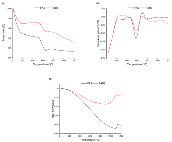 Figure 11 shows the TGA, DTG and DSC curves of FAS and FAB8 geopolymers. Based on TGA/DTG results (Figure 11a,b), a significant mass loss was observed at a temperature below 200 °C. This was attributed to the evaporation of the weakly absorbed and chemically bound water in the geopolymer matrix, as previously reported [35]. Lower mass loss was observed in FAB8 geopolymers in this section, indicating FAB8 geopolymers exhibited lesser water content than FAS geopolymers. After 200 °C, the rate of mass loss reduced, and an intense peak was found at around 600 °C, which was associated with the CaCO3 decomposition [33]. There was no noticeable mass change beyond that temperature for both FAS and FAB8 geopolymers, which was commonly reported in previous works [47].