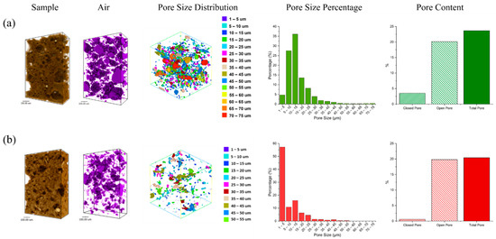 The pore structures, pore size distribution with pore size percentages and pore content of FAS and FAB8 geopolymers using synchrotron X-ray tomography were illustrated in Figure 12. FAS and FAB8 geopolymers at 1100 °C and 1000 °C, respectively, were selected to evaluate the pore structure due to their high-strength performance. The FAS geopolymers (Figure 12a) had higher porosity than the FAB8 geopolymers (Figure 12b) as more “air” space (purple color) was observed. This complied with the porosity measurement in Figure 7. Moreover, the pore size range of the FAS geopolymers was wider (1–75 μm) than the FAB8 geopolymers (1–55 μm). For instance, 57.22% of the pores in the FAB8 geopolymers fall in the range of 1–5 μm, while 57.86% of the pore size of the FAS geopolymers ranged from 5–20 μm. This indicated that the FAS geopolymers had a larger pore size, resulting in lower flexural strength as larger pores could easily initiate flexural failure.