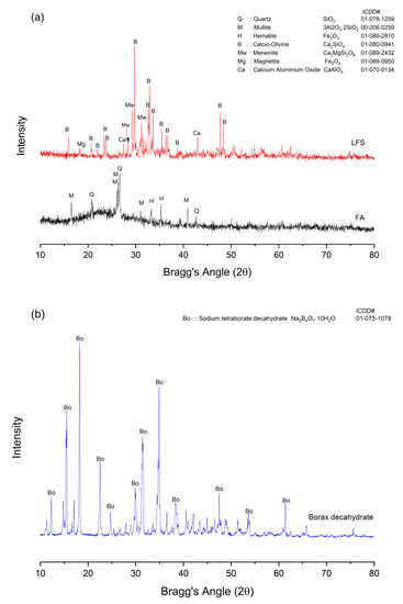 Figure 13 displays the XRD diffractograms of FA, LFS and borax decahydrate. The XRD patterns demonstrate that FA contained mineral phases of quartz (SiO2) and mullite (3Al2O3∙2SiO2) with minor phases of hematite (Fe2O3). A broad hump was observed in FA from 15°–35° (2θ), indicating the amorphous characteristics of the materials. The primary phases found in LFS were calcio-olivine (Ca2SiO4) with glassy phases of merwinite (Ca3MgSi2O8), magnetite (Fe3O4) and calcium aluminum oxide (CaAl2O4). For borax decahydrate, only intense peaks of sodium tetraborate decahydrate (Na2B4O7·10H2O) were detected.