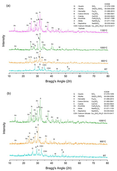 On the other hand, no new additional band was observed in heated thin geopolymers. In fact, the band for the bending vibrations of Ca–O and Si–O of both the FAS and FAB8 geopolymers disappeared at high temperatures. This might be attributed to the decomposition of calcite and formation of anorthite at high temperature [49], which was consistent with the TGA and XRD results in Figure 11a and Figure 14, respectively. Moreover, the main band for the asymmetrical stretching vibration of Si–O–Si and Si–O–Al broadened at elevated temperatures. This was associated with the structural disorder, which was in parallel with previous studies [10,60]. Moreover, an increase in transmittance percentage of the bands at ~3300 cm−1 and ~1650 cm−1 was observed, demonstrating the decrease in the intensity of H–O–H and –OH bonding, and proving the full dehydration of geopolymers at high temperatures.