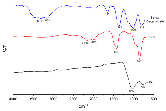 FTIR spectra of raw FA, LFS and borax decahydrate.
