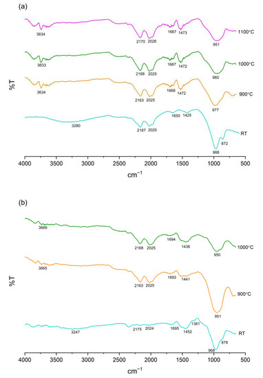 FTIR spectra of (a) FAS and (b) FAB8 geopolymers at elevated temperatures.