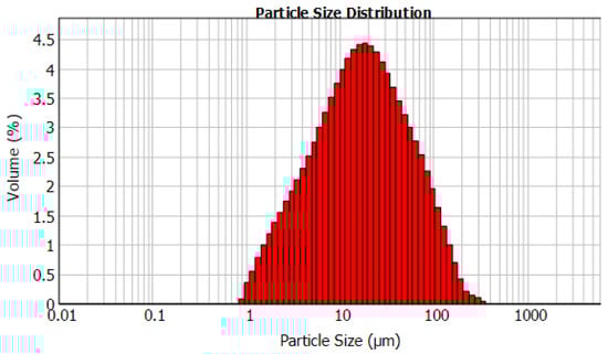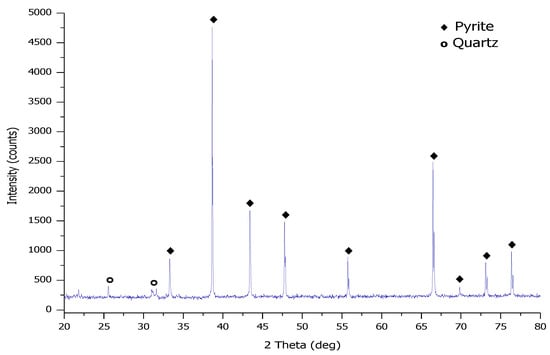 The pyrite (FeS2) sample used in this study was obtained from Mintek, South Africa. Figure 1 displays the X-ray diffractogram (XRD) (Bruker, Karlsruhe, Germany) of the phase composition of the pyrite sample. Table 1 presents the chemical composition of the pyrite sample determined via X-ray fluorescence (XRF). To determine the particle size distribution (PSD), the pyrite sample was measured 3 times via laser diffraction (Mastersizer 2000). The average particle size and the standard deviation were determined and calculated to be d10 = 3.3 ± 0.6 µm, d50 = 18 ± 3.2 µm, and d90 = 77 ± 2.2 µm (Figure 2). The pyrite sample was dried in an oven and screened with stainless steel sieves to obtain different fraction sizes in the range of 53–212 µm using an electronic sieve shaker (Eriez model ES 200, Malvern, Worcestershire, UK).