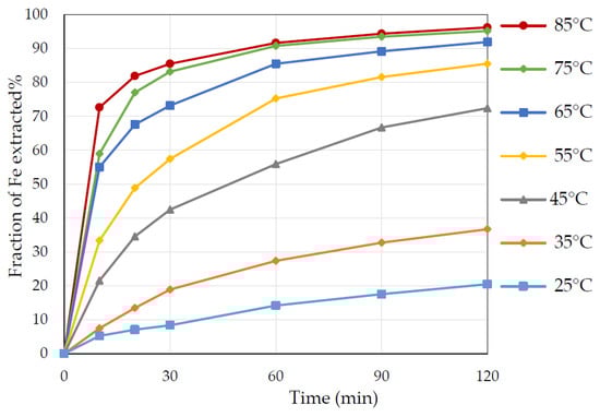 The evaluation of the effect of temperature was conducted on pyrite dissolution in 3 M nitric acid, where the temperature varied from 25 to 85 °C. Temperature vastly influences the process because it affects the rate of the leaching process, i.e., both the diffusion and the reaction rate []. The results of this experiment are presented in Figure 5. There was less than 20% and 40% iron extraction at temperatures of 25 and 35 °C. However, a marked increase to over 70% of iron extraction occurred at 45 °C. This was followed by a moderate increase in iron extraction to 85% at 55 °C, and the most iron extraction of more than 95% at 75 °C and 85 °C.