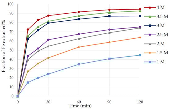Time dependence of iron extraction from pyrite with different nitric acid concentrations (1–4 M). Conditions: temperature 65 °C, S/L ratio 1 to 20, particle size +75–106 µm.