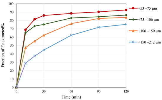 The effect of particle size on Fe extraction as a function of time. Conditions: 3 M nitric acid, temperature 65 °C, S/L ratio 1 to 20.