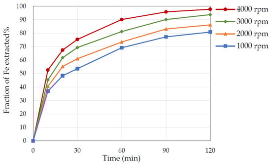 The effect of stirring speed on Fe extraction as a function of time. Conditions: 3 M nitric acid, temperature 65 °C, S/L ratio 1 to 20, particle size +53−75 µm.