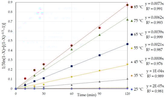 Graphs of 1/3ln (1 − X) + [(1 − X)−1/3 −1] = k.t vs. time (min) at various temperatures of 25 to 85 °C for the dissolution of pyrite in 3 M nitric acid.