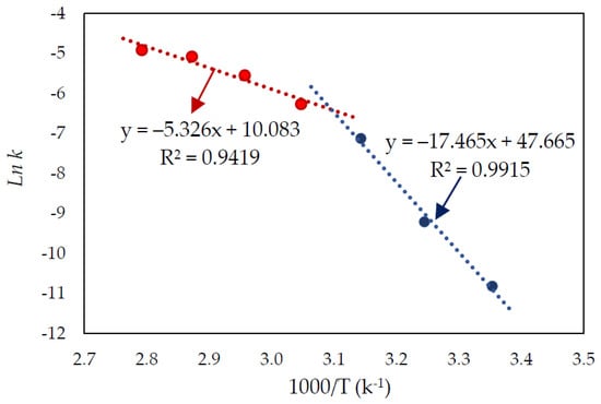 The rate constant (k) was obtained from the slope of each straight line in Figure 9. Figure 10 represents the graph of lnk as a function of 1000/T, where the slope of this graph is equal to −Ea/R. As shown in Figure 10, the slope changed over the studied temperature range, with a higher activation energy of 145.2 kJ/mol at the lower temperature (25–45 °C), and a lower activation energy of 44.3 kJ/mol at higher temperatures (55–85 °C).