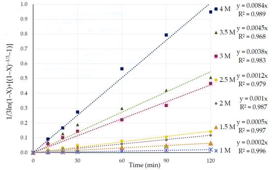 The function of the equation 1/3ln (1 − X) + [(1 − X)−1/3 −1] = k.t versus time was also evaluated with the experimental results on pyrite dissolution in varied concentrations of nitric acid solution from 1 to 4 M. As was the case for varying temperatures, the new variant of the shrinking core model produced a straight line, which fit with R2 values close to one for the different nitric acid concentrations (Figure 11).