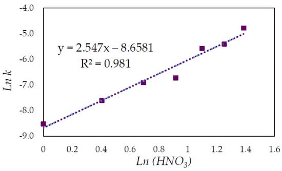 The slope of each straight line from Figure 11, at various HNO3 concentrations at a temperature of 65 °C, was plotted as lnk versus ln(HNO3) to determine the reaction order with regard to HNO3 (Figure 12). Based on the slope of the graph, the resulting empirical order with regard to HNO3 was 2.55.