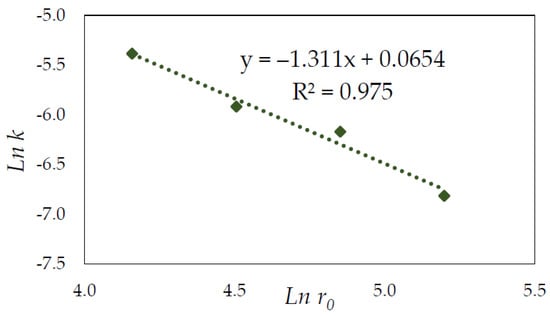 The same process was performed with the obtained results on the pyrite dissolution with different particle size fractions from 53 to 212 µm. The plot of the equation vs. time produced straight lines. The slope of each straight line was plotted as lnk versus ln(r0) to determine an empirical order concerning r0, which was calculated to be −1.3, based on the slope (Figure 13).