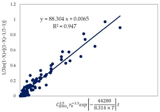 1/3ln (1 − X) + [(1 − X)−1/3 − 1)] = k0 [HNO3]2.6 r0−1.3 e−44280/RT.t