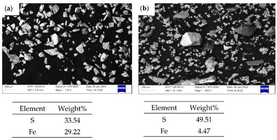 The backscattered SEM-EDS images of (a) pyrite before leaching and (b) after leaching in nitric acid.
