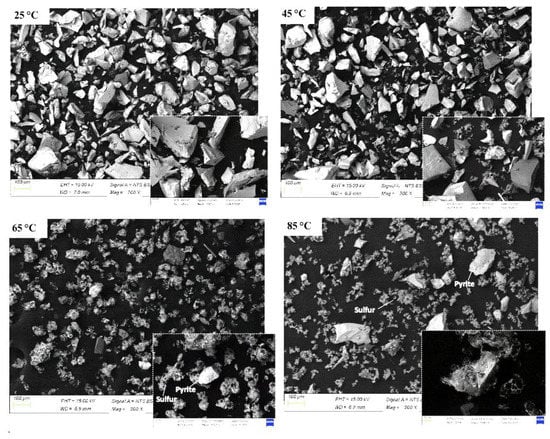 SEM images of pyrite residue at different temperatures of 25, 45, 65, and 85 °C.