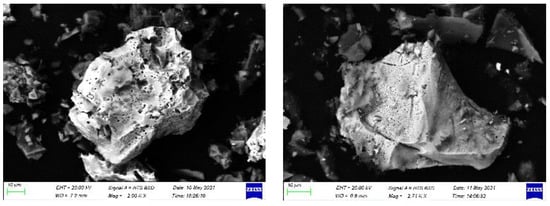 The pyrite sample before leaching and after leaching (residue) with nitric acid was examined with SEM-EDS. The SEM-EDS of pyrite before leaching detected 33.5% and 29.2% (weight%) of S and Fe, respectively. However, on the residue, the amount of sulphur increased to 49.5% and the Fe decreased to 4.5% owing to the formation of sulphur as the result of the oxidative dissolution of pyrite (Figure 15). Figure 16 shows the SEM images of the residue at 25, 45, 65, and 85 °C after leaching in 3 M nitric acid for 120 min. As the temperature increased, more pyrite particles dissolved, leaving fewer pyrite particles at the higher temperatures of 65 and 85 °C. This confirmed the positive effect of increasing the temperature on the dissolution of pyrite. Moreover, due to the oxidative dissolution of pyrite in nitric acid, sulphur formed as an amorphous product around the pitted pyrite grain. Therefore, in the nitric acid medium, the surface of the pyrite grain became rough and pitted with cavities (Figure 17) and the oxidative dissolution led to the formation of sulphur, as seen in the images.