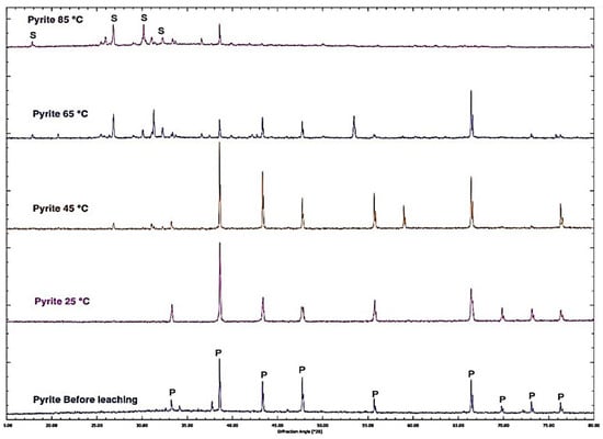 The pyrite samples were examined with XRD before and after leaching in 3 M nitric acid at different temperatures of 25, 45, 65, and 85 °C. As illustrated in Figure 18, by increasing the temperature, the intensity of the pyrite peaks decreased owing to the pyrite dissolution. Interestingly, a new sulphur phase appeared, confirming the sulphur formation seen in the SEM images.