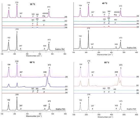 The Raman spectra of pyrite residue leached in 3 M nitric acid at various temperatures of 25, 45, 65, and 85 °C, showing the Raman spectra of pyrite and sulphur separately.