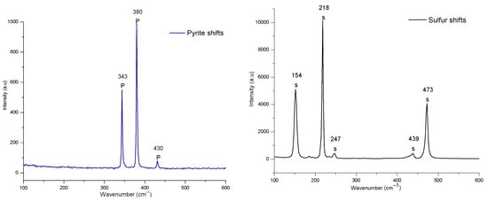 Figure 19 illustrates the spectra for the Raman analysis of the solid residue of pyrite after leaching in 3 M nitric acid at various temperatures. The Raman laser contacted each residue at four spots (a, b, c, and d) and detected both pyrite and sulphur at all studied temperatures. To see the pyrite and sulphur shifts clearly, their Raman shifts were depicted separately as the last two graphs presented in Figure 19. As depicted in the spectra, pyrite had three shifts at frequencies of approximately 343, 380, and 430 cm−1, and sulphur had three strong and two weak shifts situated at 154, 218, 247, 439, and 473 cm−1, respectively. The positions of the pyrite and sulphur shifts in the Raman analyses agreed with research by Xia et al. [] and Toniazzo et al. []. Xia et al.’s [] work focused on the surface analysis of sulphur species on oxidised pyrite, while Toniazzo et al.’s [] work focused on sulphur speciation and quantification at the surface of pyrite. The Raman analysis also confirmed the formation of the sulphur product as the result of oxidative leaching of pyrite in nitric acid.
