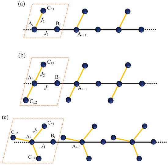 Schematic structure of the spin-1/2 XXX Heisenberg model on the branched chains (a)  with one, (b)  with two, and (c)  with three intra-chain interactions .  denotes inter-chain interaction. In each case, the dotted rectangle indicates a unit cell that uniformly repeats throughout the chains. Solid balls labeled as A, B, and C represent spin-1/2 particles in a unit block, and the balls marked with  indicate the side spins.