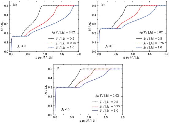 As can be seen in Figure 2, the magnetization of each spin chain shows an abrupt jump when the magnetic field increases from zero. This quantity reaches an intermediate magnetization plateau at the fractional value . This single plateau coincides with the gapful Lieb–Mattis (LM) ferrimagnetic ground state [,]. Obviously, increasing the number of side spins n results in enhancing the height and width of LM plateau. The intermediate plateau terminates at a critical magnetic field due to a quantum phase transition to a Luttinger spin liquid phase. Evidently, increasing the interaction ratio  enhances the region of the spin liquid phase, as well as the saturation field, while increasing the number of side spins restricts the region of the spin liquid phase and decreases the saturation field (compare Figure 2a with Figure 2b,c).