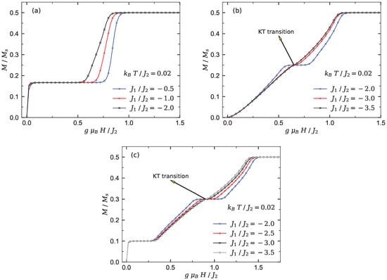 By inspecting Figure 3b, we realize that except for the case shown in Figure 2b, the magnetization of the model  under condition (II) shows a wide spin liquid phase at low magnetic fields instead of the LM ferrimagnetic phase. An intermediate magnetization plateau at one-half of the saturation value appears at moderate magnetic fields. We find that this intermediate magnetization plateau terminates at a quantum KT critical point when the absolute value of interaction ratio  increases.