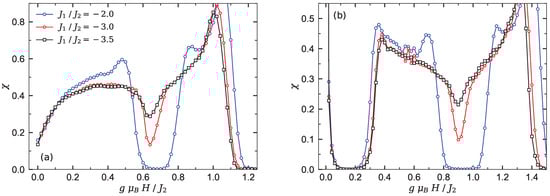 The low-temperature susceptibility  versus magnetic field for (a) the Heisenberg branched chain  and (b) chain , at  under the condition (II). Three different values of the inter-chain interaction  are considered for the both panels.