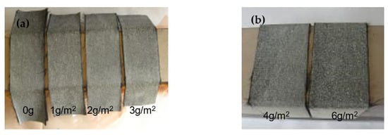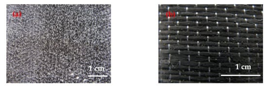 The operability of the BT5501A tackifier was examined for the RTM process. The softening point temperature of BT5501A is 74.2 ± 0.5 °C. It was pulverized at room temperature, sieved, and evenly spread on the surface of the CF fabric, as shown in Figure 1a. The fabric was then baked near the softening point, and after baking, the tackifier turned into microspheres adhered to the surface of the fabric, as shown in Figure 1b. These microspheres cannot be easily detached from the surface of the fabrics. The results demonstrate the suitable operability of the tackifier.