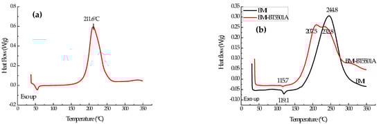 The black curve in Figure 2b is the DSC curve for BMI with a maximum exothermic peak at 244.8 °C and a small endothermic peak at 119.1 °C. The BMI resin used herein is an allyl bisphenol A-modified diaminodiphenylmethane-type bismaleimide resin. For preparing the resin, the allyl bisphenol A and the diaminodiphenylmethane-type bismaleimide powder were prepolymerized at 130 °C/15 min. Thus, the small endothermic peak at 119.1 °C should be ascribed to the dissolution of unpolymerized bismaleimide powder into an allyl bisphenol A solution. Without a catalyst, the copolymerization of bismaleimide and allyl bisphenol A is mainly the addition reaction between the C=C bond and a terminal alkenyl group, and the reaction temperature is around 150–200 °C []. The Diels–Alder reaction of the C=C bond between allyl and maleimide rings contains two steps. The first step is a diene addition reaction of a maleimide group and an allyl group, forming a 1:1 addition product. The reaction generally occurs at about 120 °C, with a low activation energy. The second step is a Diels–Alder addition reaction of the BMI with the addition product to form a ladder network structure; the reaction temperature is higher than 200 °C. These characteristics require that the post-treatment temperature of the allyl compound-modified BMI resin should be higher than 230 °C [].