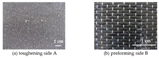 When a thermoplastic resin is used to toughen the RTM composites, neither the thermoplastic resin film nor the powder-toughened CF preform can be conventionally preformed. To achieve both interlaminar toughening and preforming, we have designed a preforming–toughening bifunctional CF fabric, as shown in Figure 6. The CF fabric was obtained by dissolving the toughening component PEK-C and the auxiliary binder BOZ in THF, and depositing on one side of the fabric by atomization spraying. On the other side of the fabric, the tackifier BT5501A was sprayed and baked to form small particles, with particle sizes between 200–600 um, obtaining a bifunctional CF fabric having a toughening function on the A side and a preforming function on the B side.