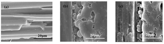 SEM images of CF/BMI (a), CF/PEK-C/BMI (b), and CF/BT5501A/PEK-C/BMI (c) composites.