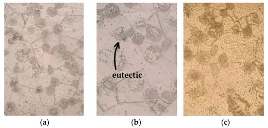 The microstructure of the initial heat-treated alloy was a δ-solid solution with the presence of a eutectic (δ + γ (MgZr12Nd)) spherical shape (Figure 1a). With increasing scandium content in the alloy, the size of the eutectic increased (Figure 1b,c).