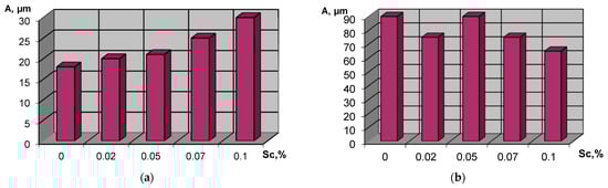 When the content of scandium in the alloy was lower than 0.3%, grain refinement was observed. A further increase in the filler modifier (up to 1.0% Sc) led to an increase in the size of the micrograins up to 160 µm (in the range of 0.02–0.3% Sc, the size of the micrograins is ~75 µm).