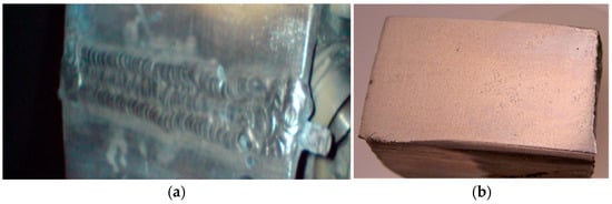 Magnesium alloy body casting element after welding: (a) magnification 0.1×; (b) macrograph.