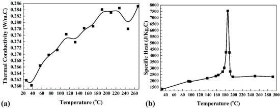 P, ρ, T, c, and k, represent the local pressure, PA6 density, temperature, specific heat, thermal conductivity, and PA6 viscosity, respectively, in Equations (1)–(5). Figure 1a,b show the specific heat and thermal conductivity of the PA6 used in this study.