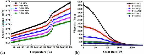 Temperature dependency of (a) specific volume and (b) viscosity–shear rate of PA6 [34,35,36,37].