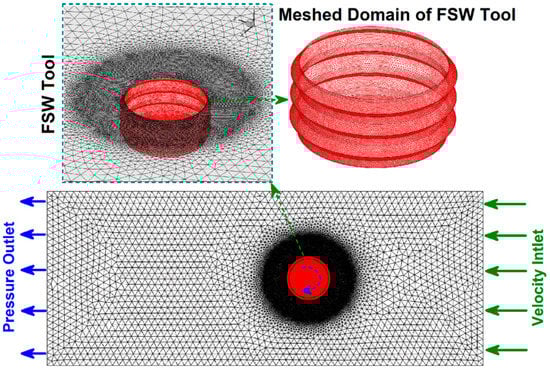 Due to the 0.1 mm distance between the tool shoulder and top of the raw sheets, the exiting materials from the joint line were limited. For this reason, the possibility of any upward flow and material exit from the joint line was neglected. Consequently, the overall errors of the simulation (compared to experimental results) were lower than 6%. Figure 3 presents the meshed domain and pin profile used in this study.